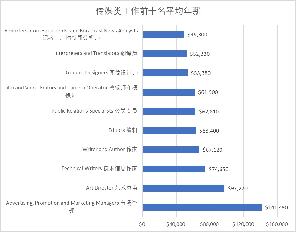 下面是美国劳工统计局对传媒类岗位做出的平均年薪在前十名的工作