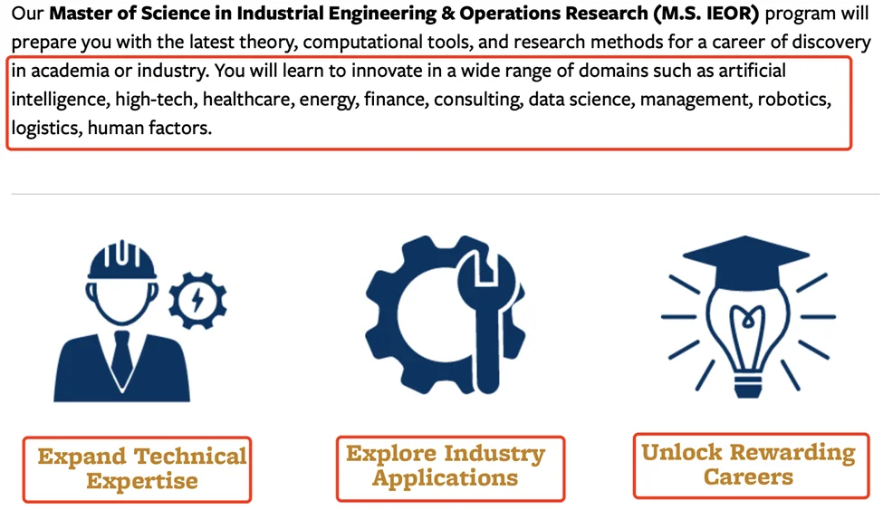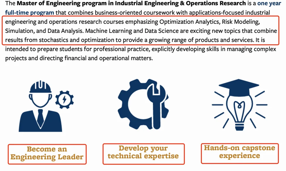(“工业工程与运营研究中的MEng项目将以业务为导向的课程与以应用为中心的工业工程和运营研究课程相结合,强调优化分析,风险建模,模拟和数据分析。机器学习和数据科学是令人兴奋的新主题,它结合了随机性和优化的结果,以提供越来越多的产品和服务。它旨在帮助学生为专业实践做好准备,明确培养管理复杂项目的技能,并指导财务和运营事务。”)
