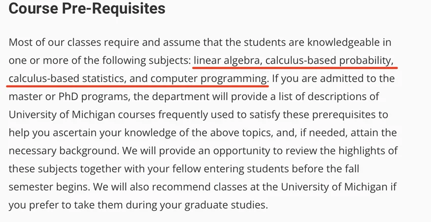 开设IEOR专业的学校一般对申请者有先修课的要求,通常要求申请者具备较强的数学功底(多元微积分/线性代数/概率论/统计学)。密歇根安娜堡分校Industrial and Operations Engineering(IOE)项目先修课要求: