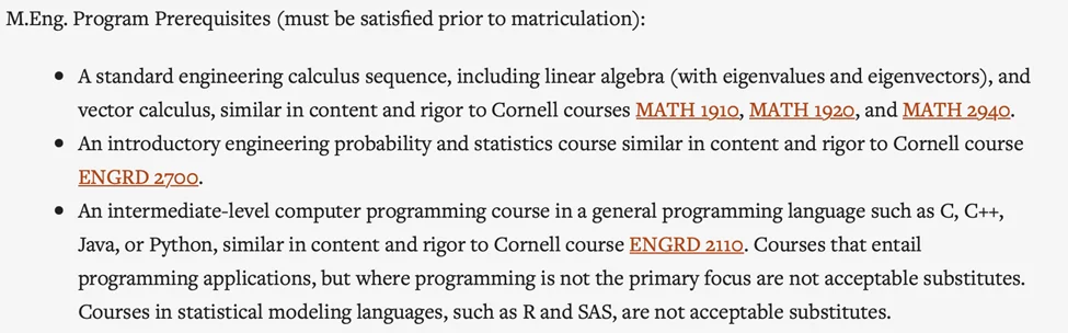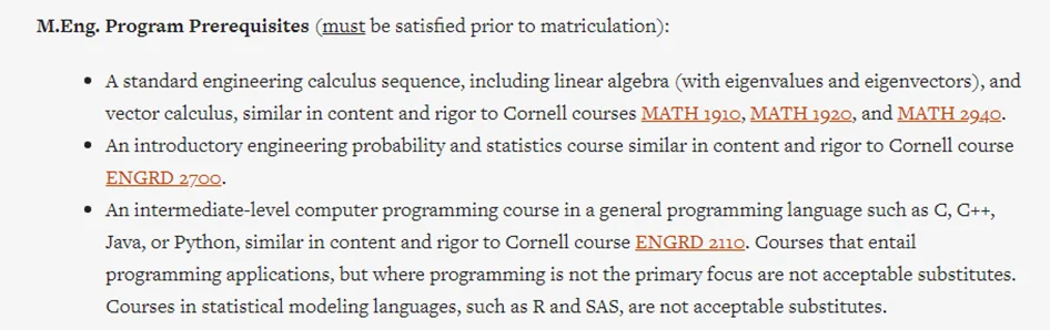 同样的,康奈尔大学M.Eng. in IEOR项目对申请人的要求如下:包括线性代数、微积分等。