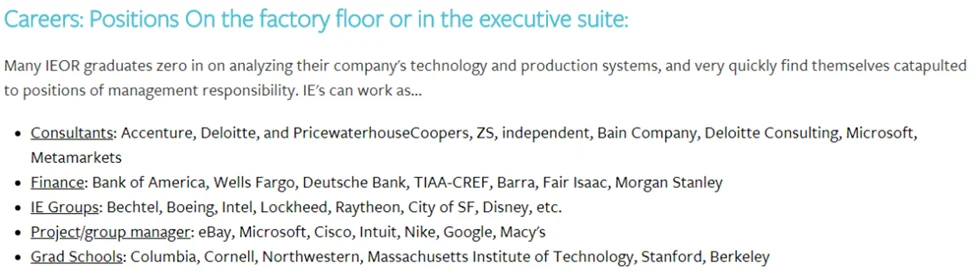 IEOR方向的毕业生可在工程、管理、科研、咨询、金融等领域获得广阔的就业机会,毕业后大多在企业的技术或产品部门里从事分析工作,如工业工程师或机械工程师。也有的会成为企业管理人员、部门主管,也有些毕业生会进入到普华永道、德勤等四大领域工作。