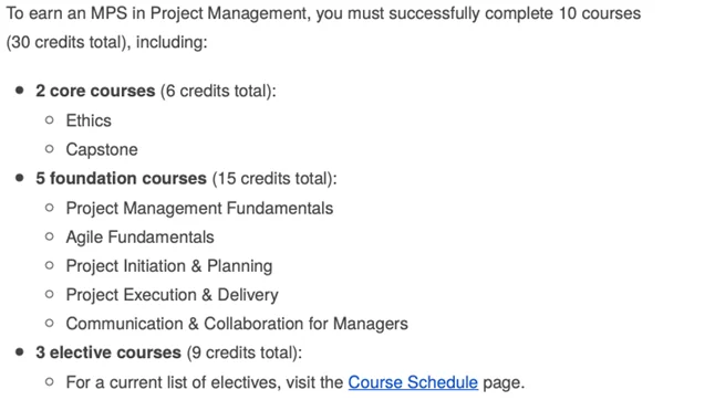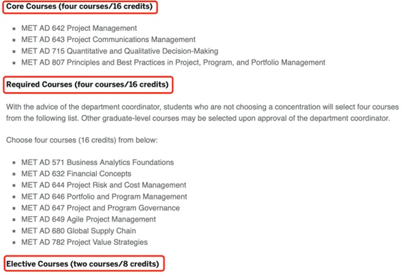 美国项目管理专业一般会结合PMI给出的项目管理“九大知识体系”,即:整合管理、范围管理、时间管理、成本管理、质量管理、人力资源管理、沟通管理、风险管理、采购管理。可以这么说,美国硕士的项目管理专业的课程设置是基于“九大知识体系”,然后再加上各自学校的特点以及侧重研究方向。以波士顿大学项目管理专业为例,他们的课程设置是这样的: