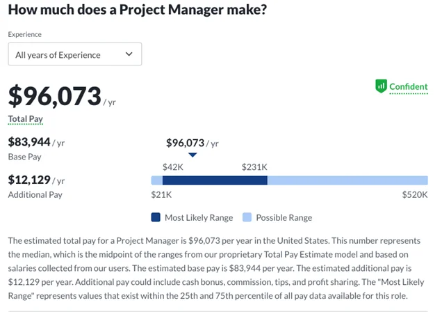 Glassdoor显示美国做项目管理的起薪大约在$96,073/年,很多项目会有各种各样的提成,所以加在一起可以达到$12,129/年。