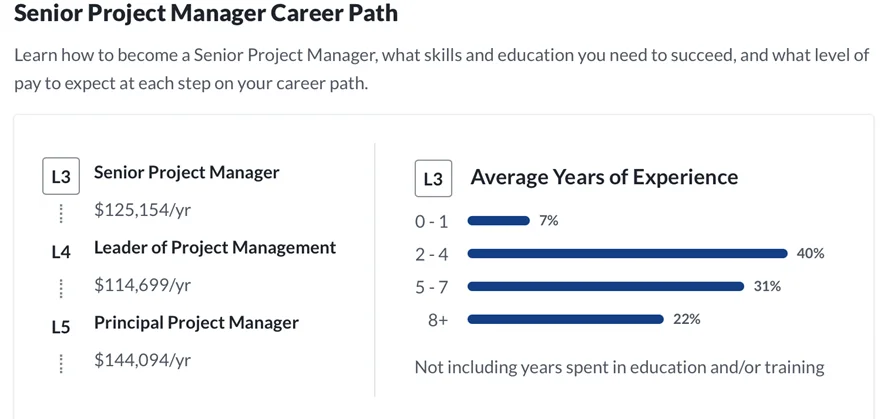 关于项目管理行业的个人发展,Glassdoor显示40%的人会在工作2-4年达到L3 Senior Project Manager。