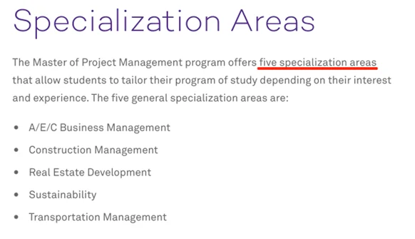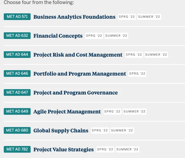 波士顿大学的PM项目要求学生除了PM基础的必修课之外还要从以下课程中选择4门specialization课程进行学习,包括: