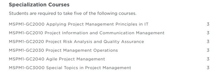 该项目要求学生除了PM基础的必修课之外还要从以下课程中选择5门specialization课程进行学习,包括: