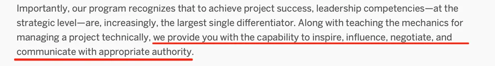 该项目的一大特点就是对学生领导才能的培养。官网强调,领导力是项目管理方向最重要的能力,所以在基础知识之外,BU也会提供相关培训内容。