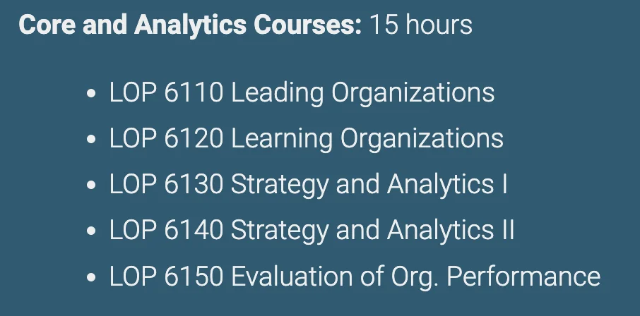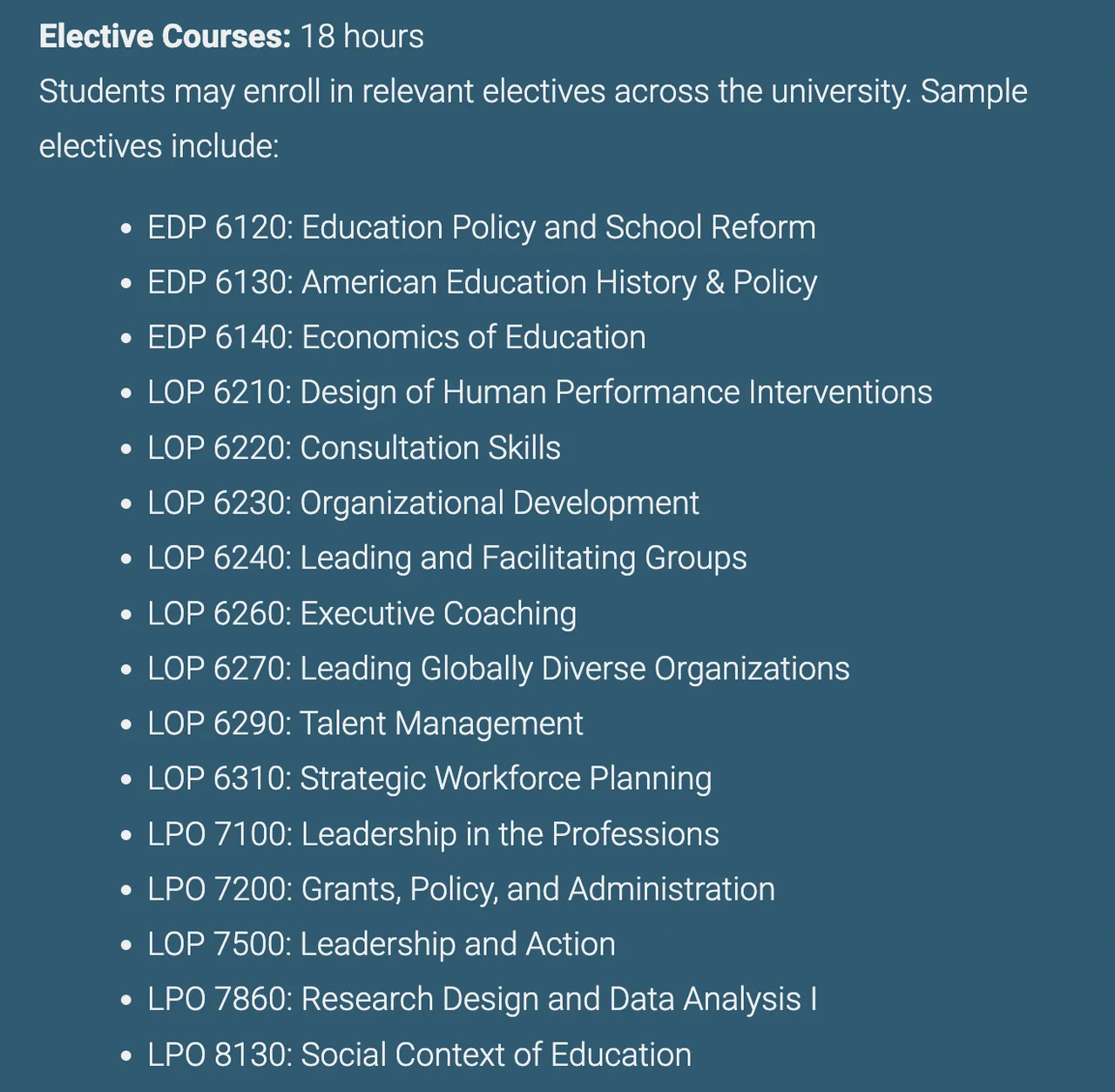 - 项目介绍:探索人类和组织绩效相互交织的环境。领导力和组织绩效硕士学位结合了相关领域的当代研究和实践,为学生领导营利性、非营利性、政府和教育组织做好准备。学生将获得对组织发展、领导理论、人才管理、循证实践和项目评估的复杂理解,同时发展自己的批判性思维、协作、人际关系、研究和领导技能。