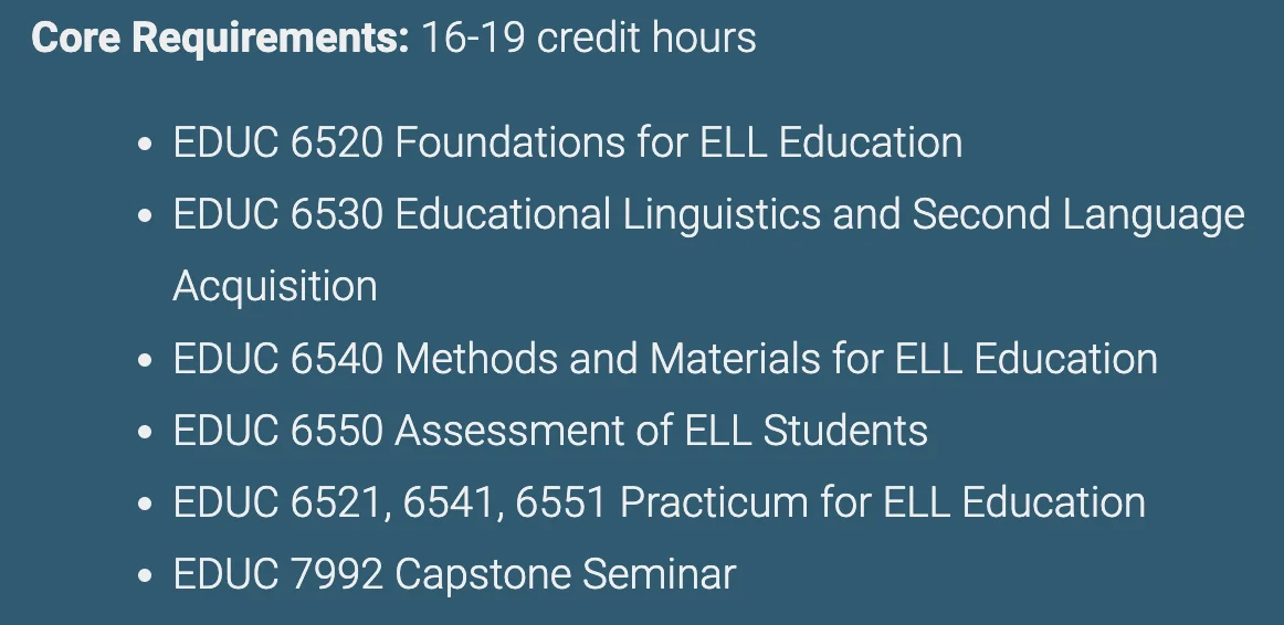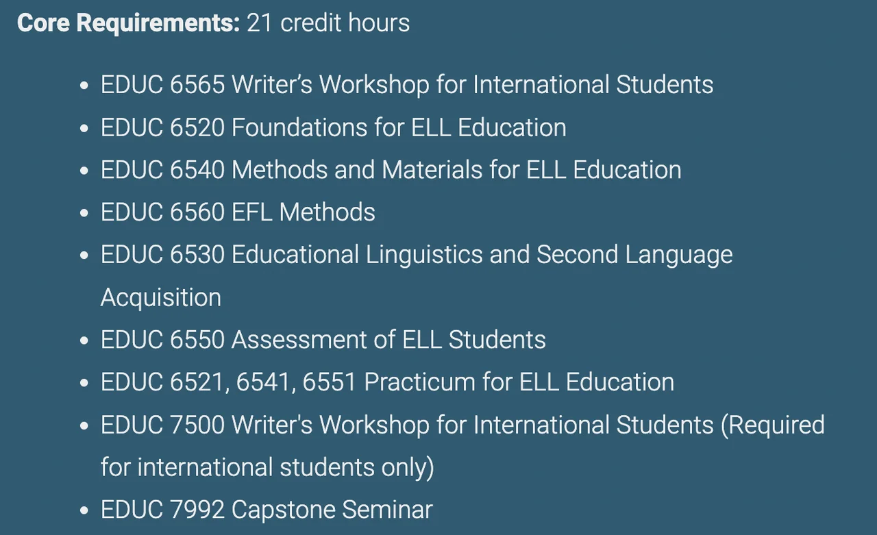 - 这一课程是为希望在美国教授英语作为第二语言的学生设计的。它要求精通英语以外的一种语言。