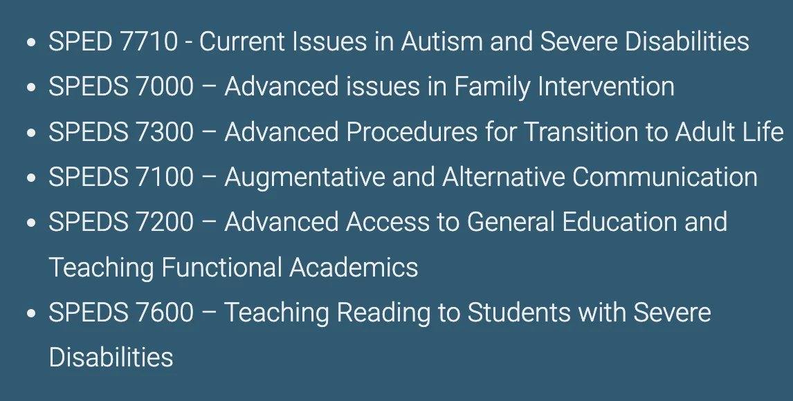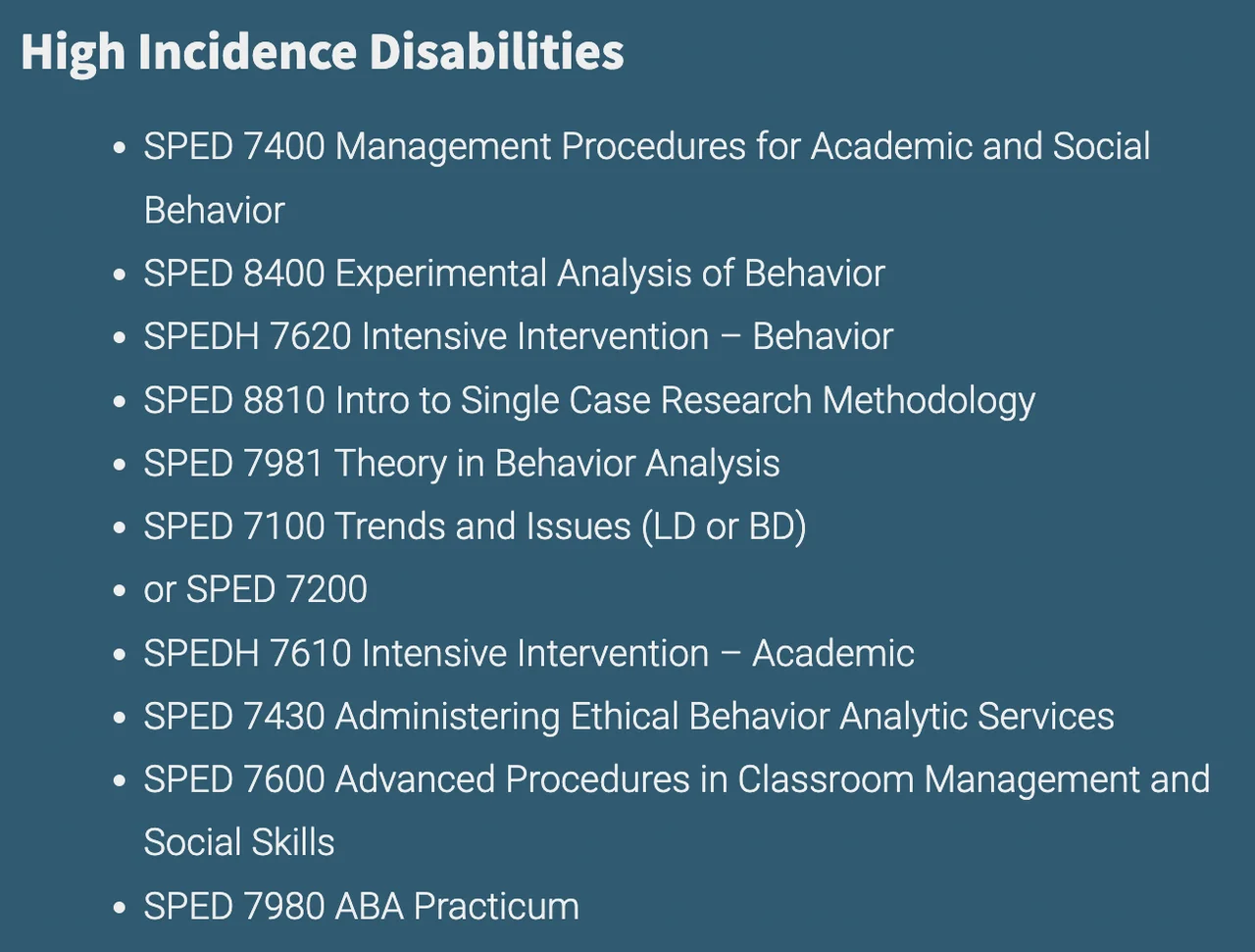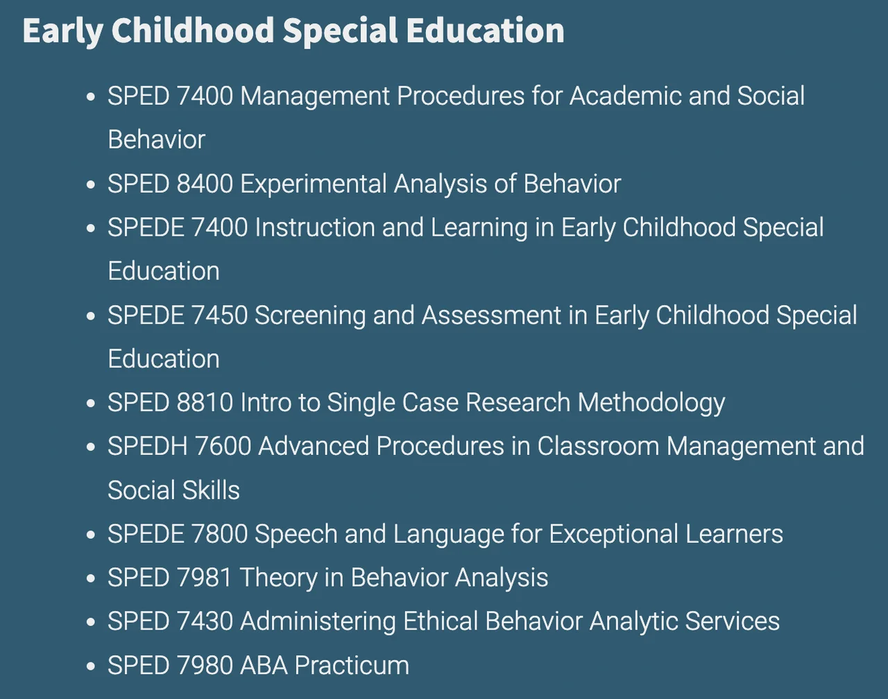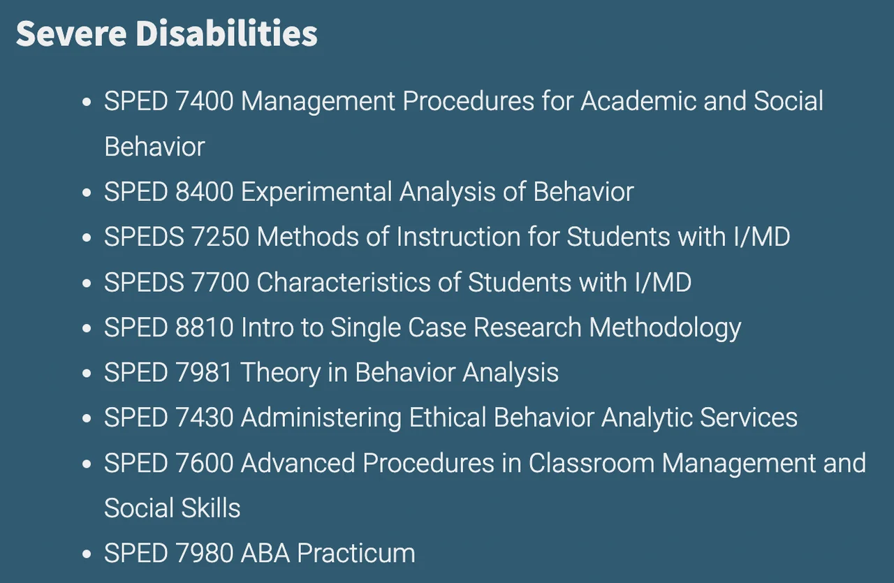 - ABA学位课程强调以实地为基础的学习和经验,并有机会参与监督研究。你要和你的指导老师商量你的学习计划。选修课与您所选择的重点领域是一致的,每一套选修课都强调ABA在特殊教育中的不同方面。强制性实践课程与集中监督的现场工作相联系,旨在帮助您满足行为分析师认证委员会建立的现场经验要求。