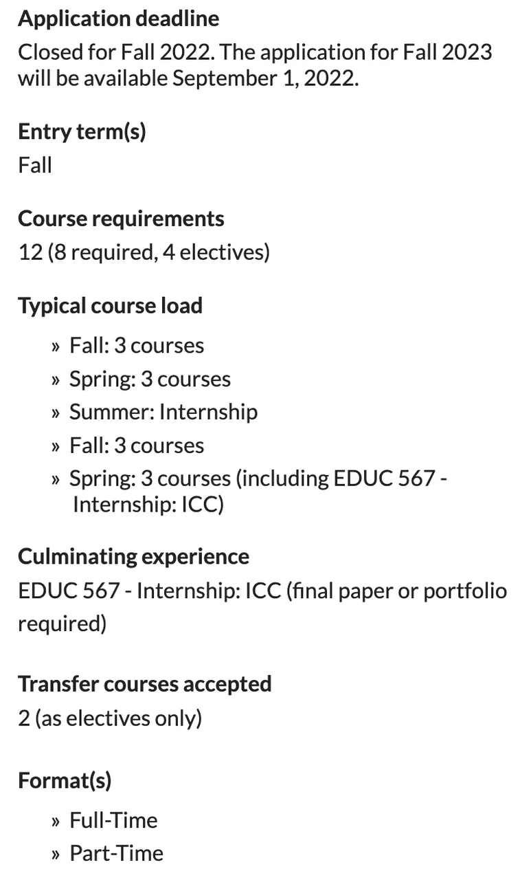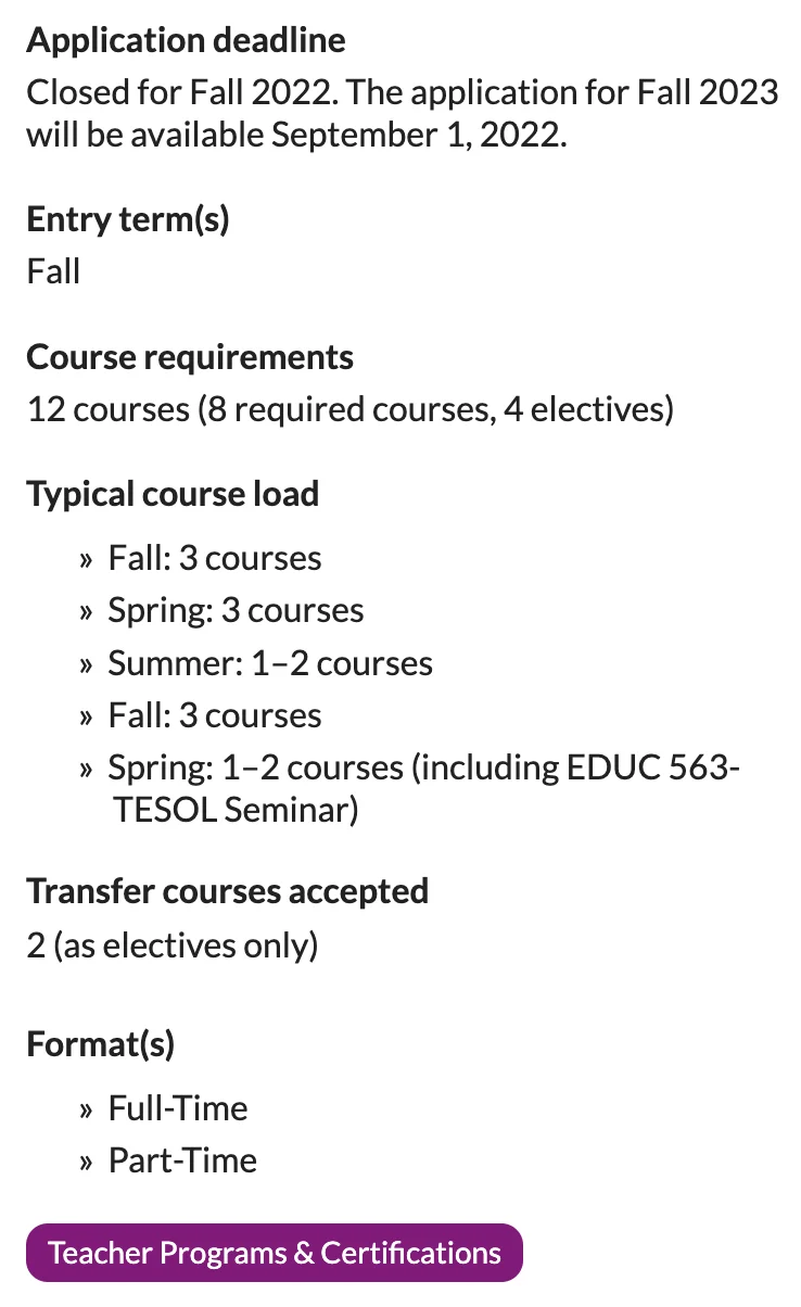 值得一提的是,该项目有一个PEDAL项目,提供教学实习资源,在学校合作的一些机构里,比如公共图书馆等地方,在第一年当助教,第二年当主要教学老师实践英语教学,同时还有30小时ESL 教学训练,对之后想从事教师行业的学生比较友好,适合对于语言教学感兴趣的学生,有很强的理论训练和实操训练,项目比较密集。对于留学生来说,毕业之后需要额外做一些准备即可拿到宾州的教师资格证。