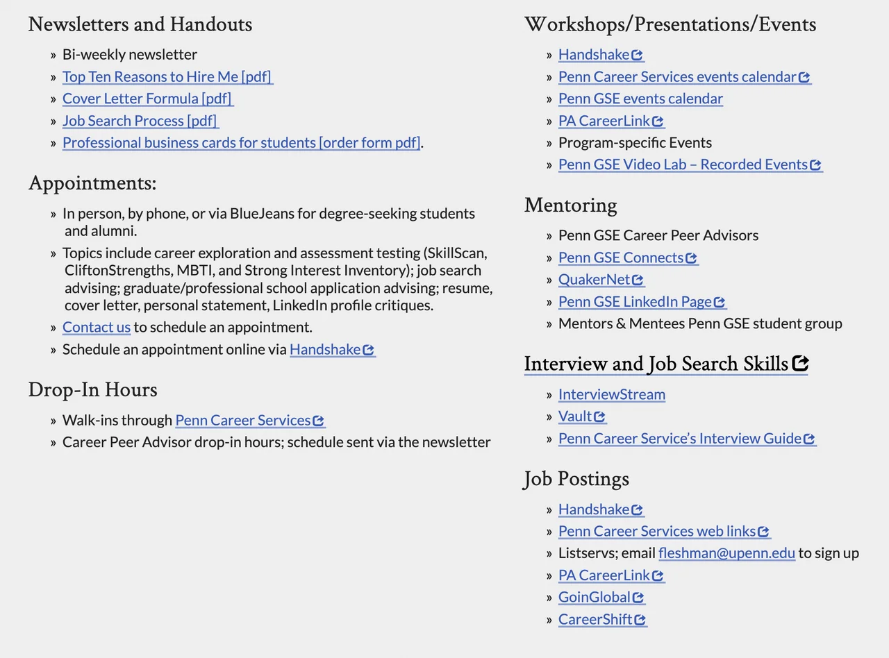 - 宾大GSE为学生提供各种工作资源与工作机会,学生可以通过career fair/workshop/appointment或者其他各种渠道来为自己争取机会