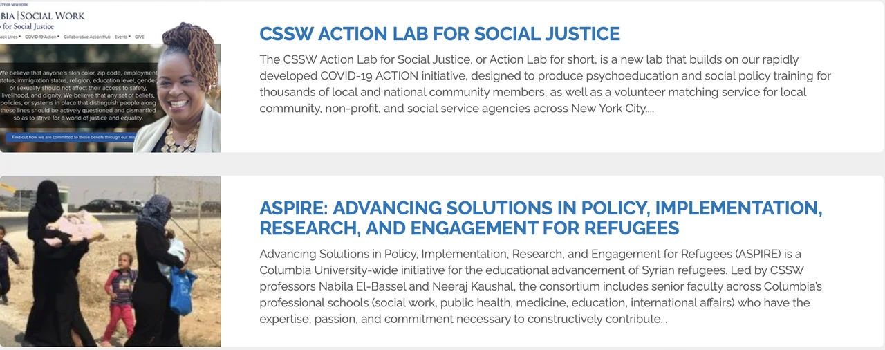 - 哥伦比亚大学社会工作学院(CSSW)是美国第一所社会工作学院,经过120多年的发展,在教育、研究、社会政策和倡导方面不断开拓新的领域。通过获得社会工作科学硕士学位,你将成为严谨知识遗产的一部分,并加入我们的承诺,建设一个更公正的世界。CSSW将权力、种族、压迫和特权(PROP)框架应用到我们的课程、实践、操作和个人互动中,以培养勇敢的空间。
