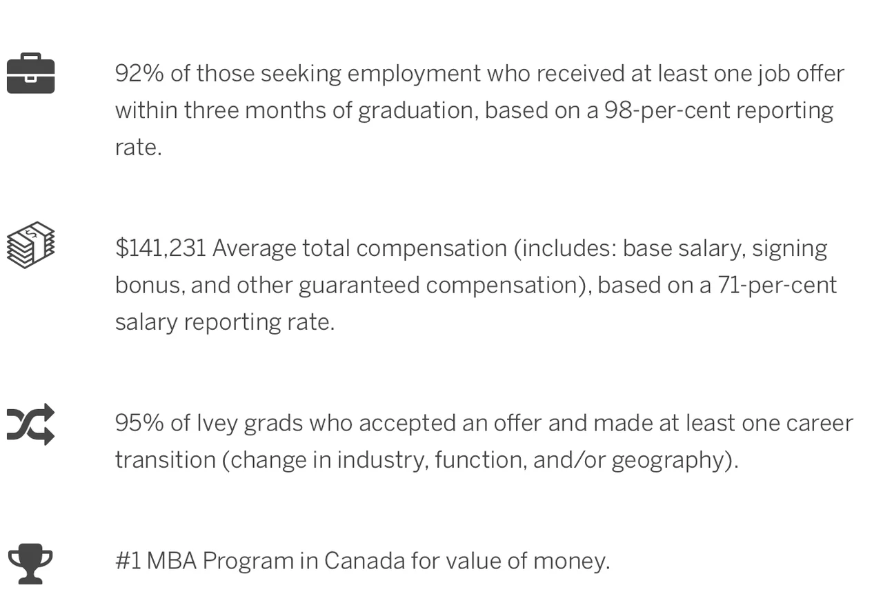- “案例教学”是Ivey商学院的一大竞争优势,学院聘请了哈佛大学(Harvard)学位的加拿大人埃利斯·h·莫罗(Ellis H. Morrow)来督导这个商业项目。通过自己独特的案例教学,可以很好的培养学生的分析能力、决策力、和实施技能的能力。