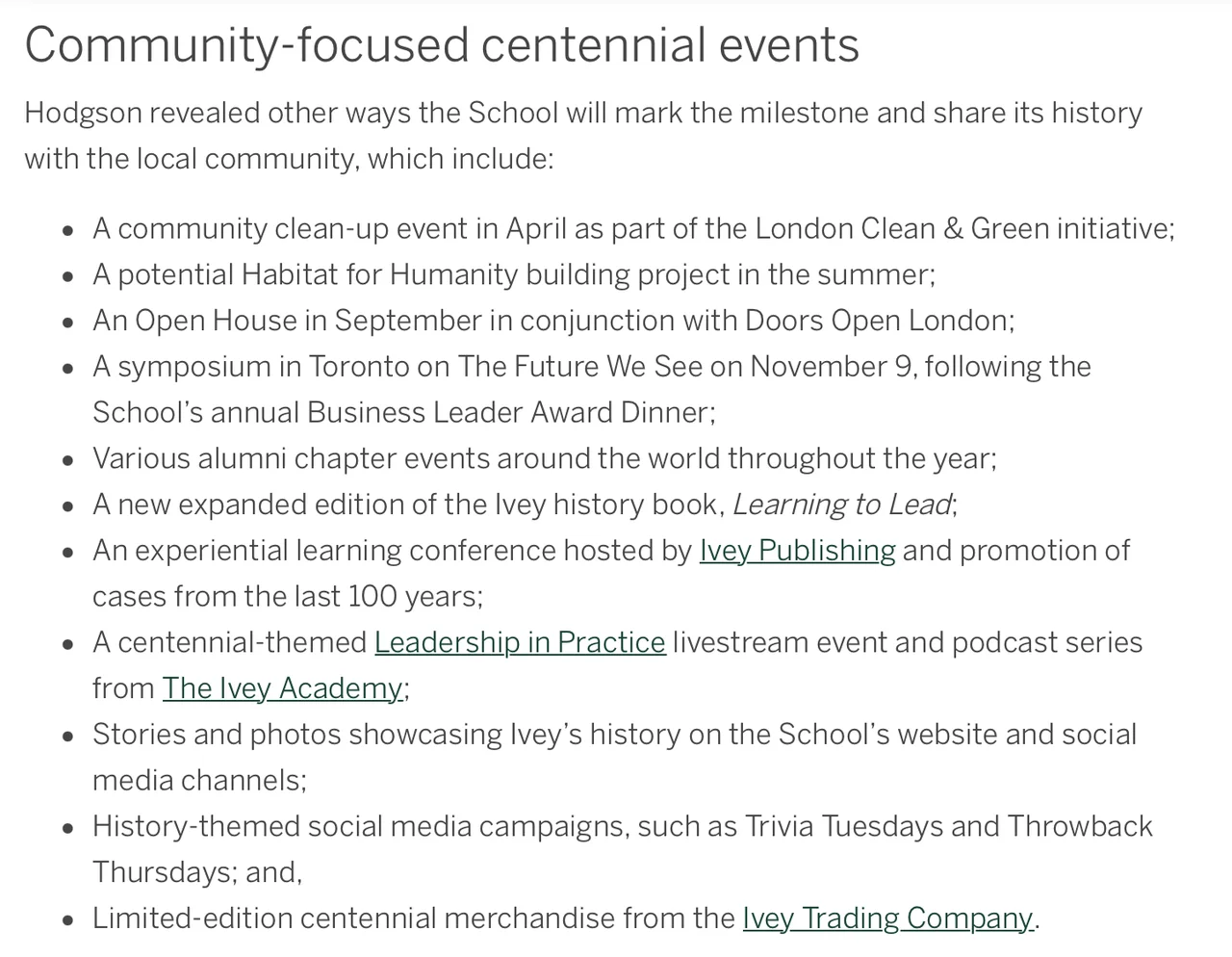 - 多项商业活动,包括9月与Doors Open London联合举办开放日; 11月9日,在学校年度商业领袖奖晚宴之后,在多伦多举办“我们看到的未来”研讨会; 全年在世界各地举办各种校友分会活动; 由毅伟出版社主办的体验式学习会议,推广过去100年的案例; 艾维学院百年主题的领导力实践直播活动和播客系列。