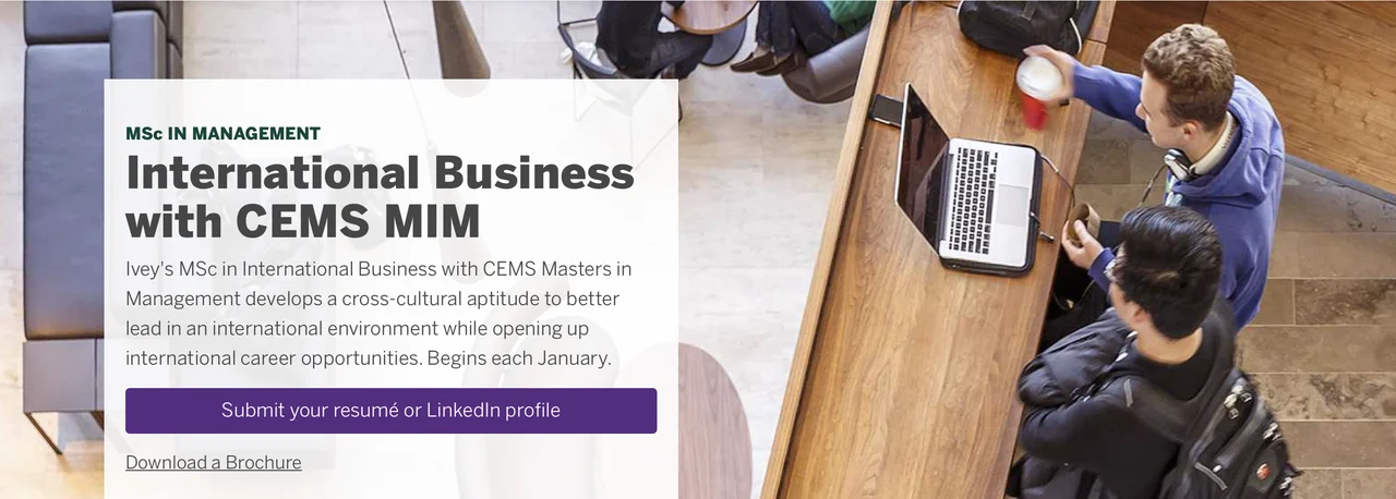 - 项目介绍:Ivey的国际商务硕士课程与CEMS管理硕士课程相结合,培养了跨文化能力,在国际环境的领导力,同时开辟了国际职业机会。每年一月开始。自英国《金融时报》2005年推出全球管理硕士排行榜以来,CEMS MIM一直排在前10名。