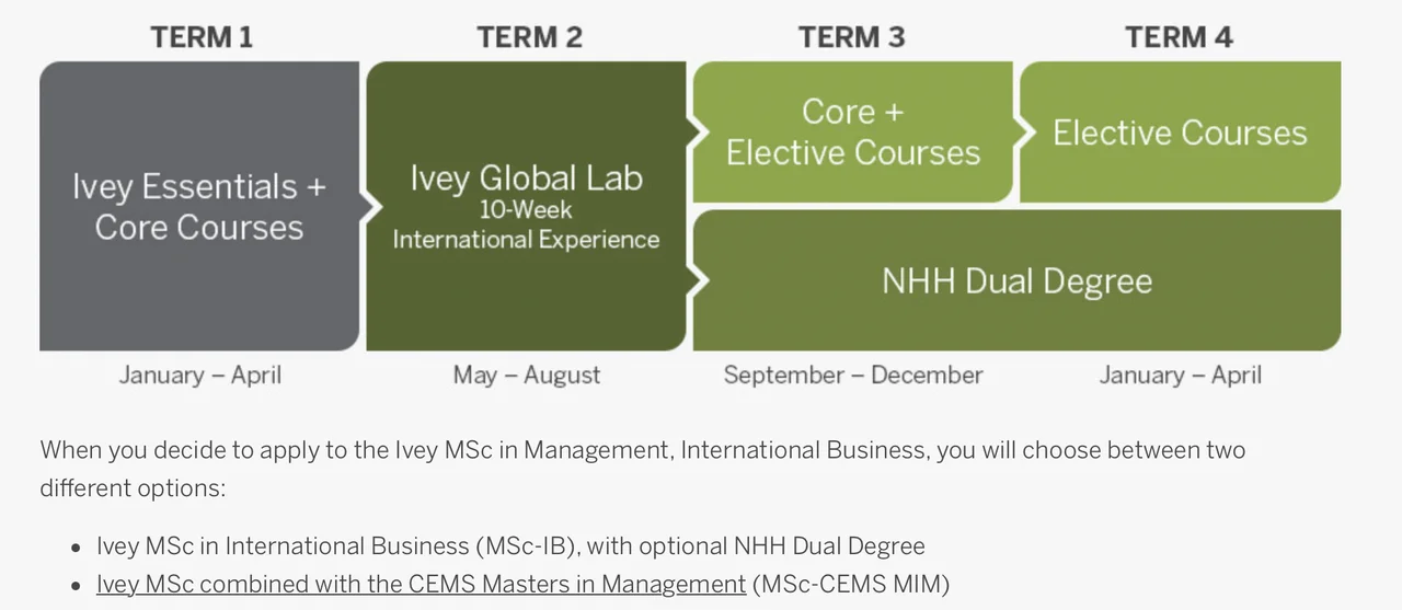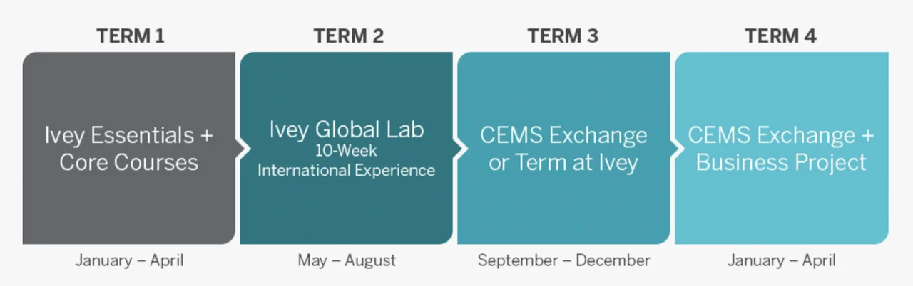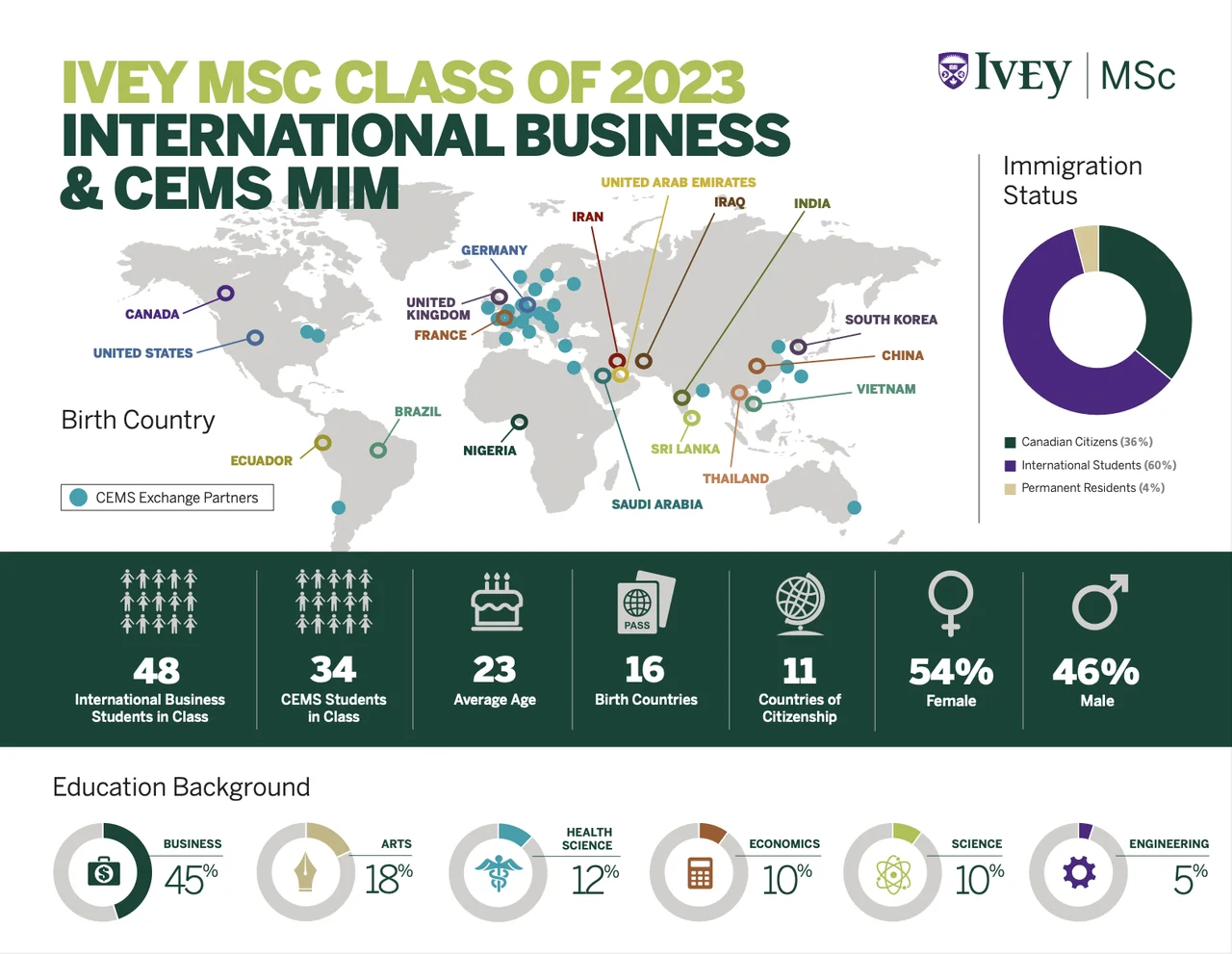 - 项目介绍:Ivey的国际商务硕士课程与CEMS管理硕士课程相结合,培养了跨文化能力,在国际环境的领导力,同时开辟了国际职业机会。每年一月开始。自英国《金融时报》2005年推出全球管理硕士排行榜以来,CEMS MIM一直排在前10名。