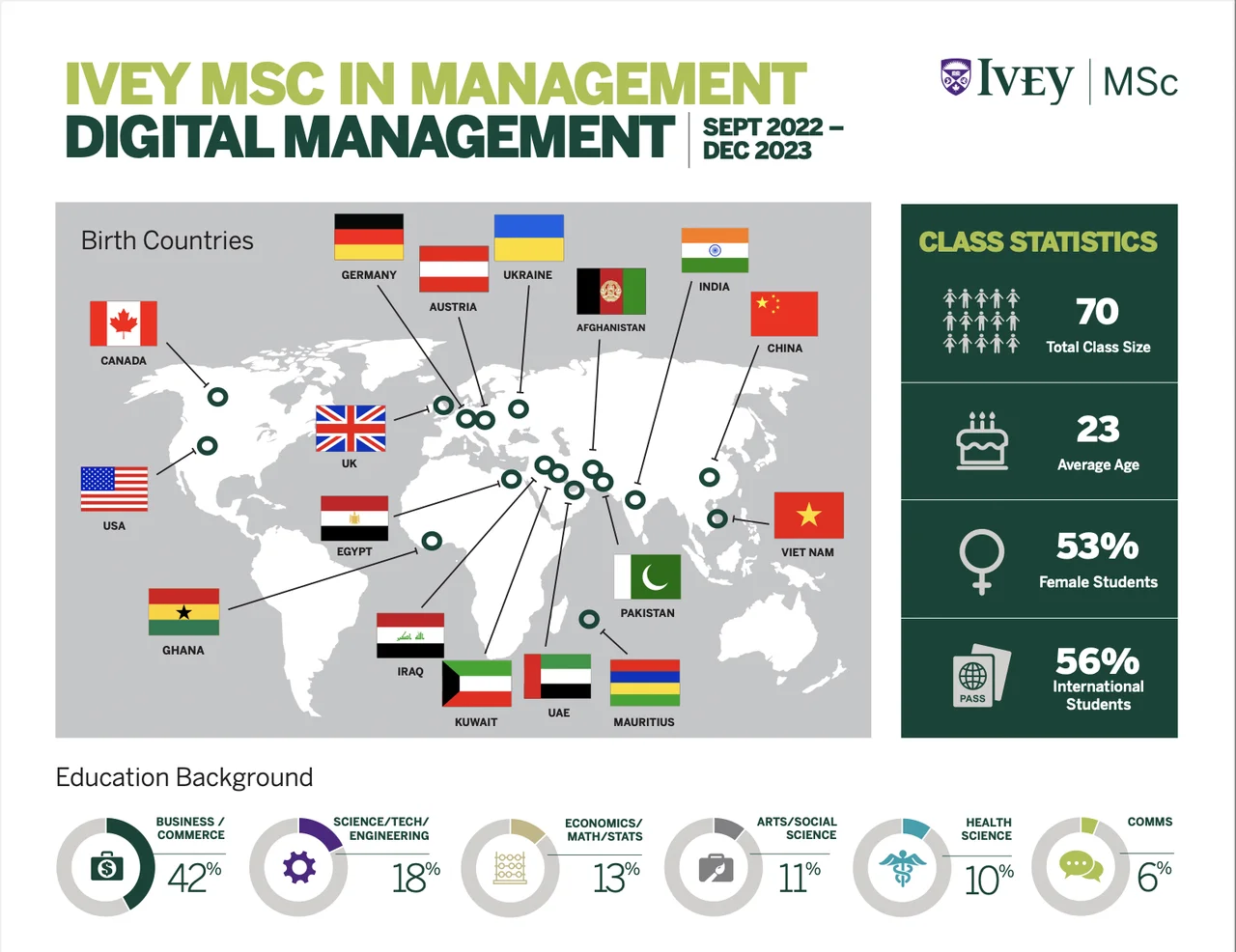 - 项目介绍:Ivey的数字管理硕士课程旨在培养能够弥合技术和业务之间差距的领导者。建立在创业思维、业务能力和强大的技术理解之上。九月开学。该课程的毕业生将应用创新技术来推动业务转型或开启新的创业。这个学位是其他学校不具备的:我们从零开始,为未来的商业需求设计学位。