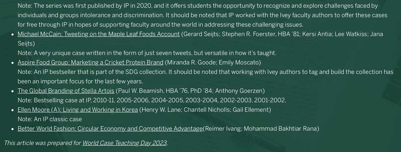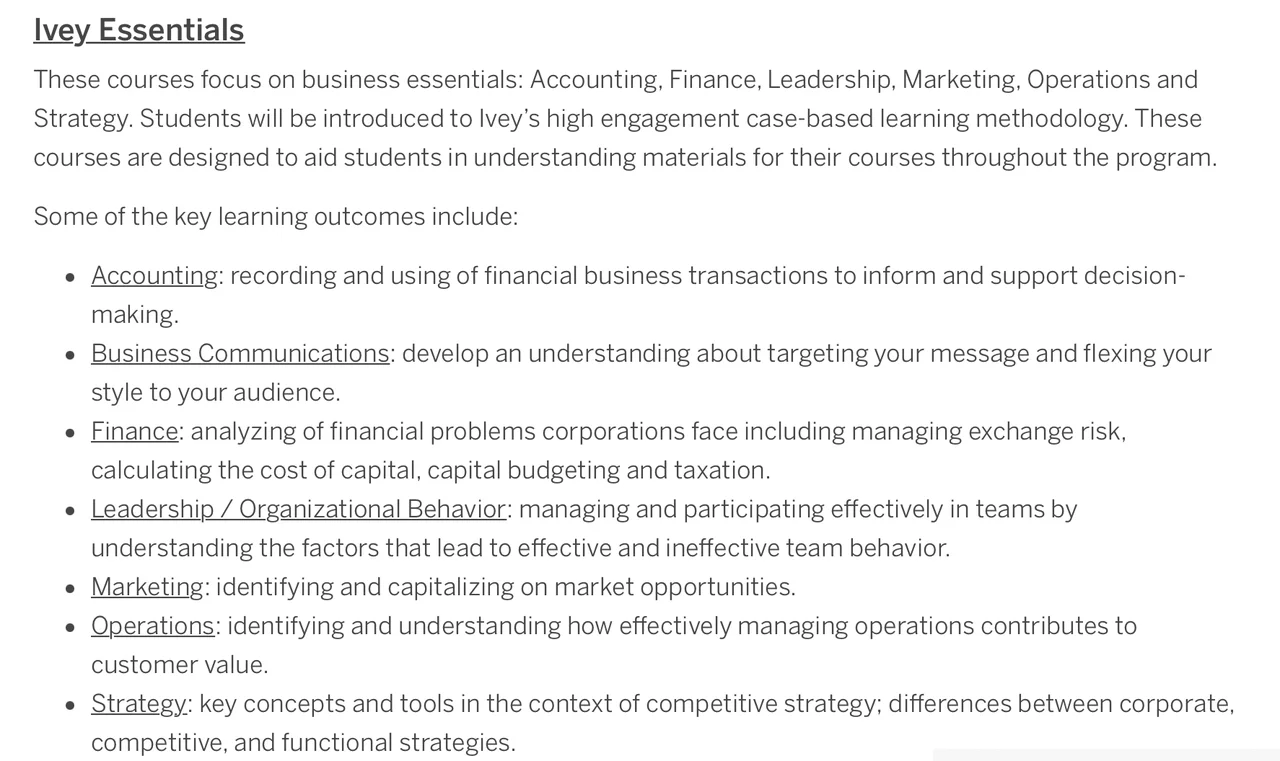 - “案例教学”是Ivey商学院的一大竞争优势,学院聘请了哈佛大学(Harvard)学位的加拿大人埃利斯·h·莫罗(Ellis H. Morrow)来督导这个商业项目。通过自己独特的案例教学,可以很好的培养学生的分析能力、决策力、和实施技能的能力。