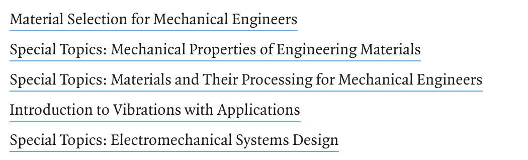 - 项目介绍:在这个项目中,学生在本科机械工程课程中学到的基础知识的基础上,学习研究生水平的课程。学生可以从一系列基础和专业课程中选择。课堂上的项目经验可以让学生在团队中工作,并将他们的技能应用于现实世界的问题,他们也可能选择进行少量的研究。鼓励学生利用校园内的许多联合课程工程和设计经验(如MechE研究生研究研讨会,其他学院或大学范围内的研究研讨会,以及卡内基梅隆竞赛等组织)。