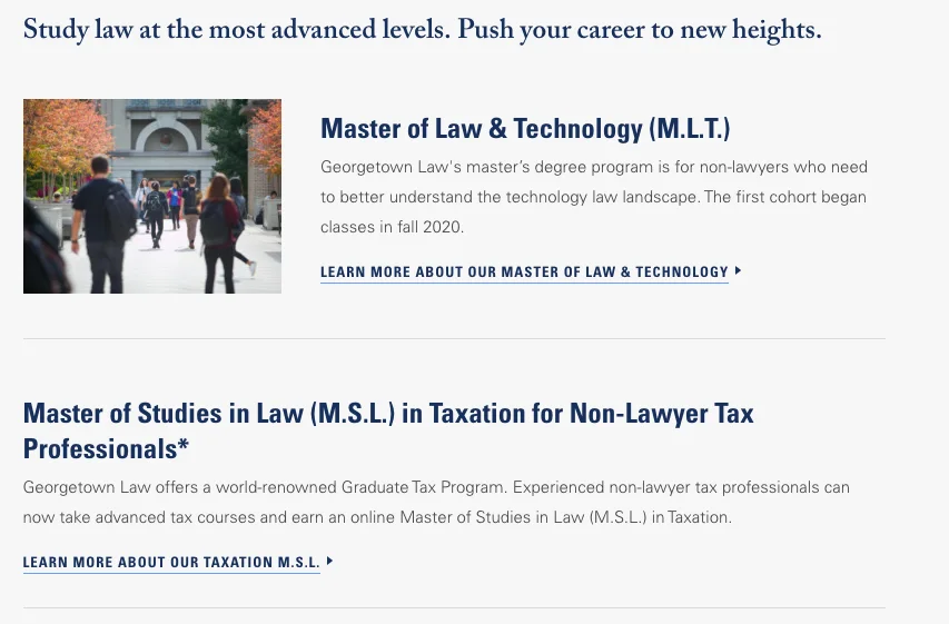 除了常规的法学项目外,乔治城大学还有两个为非律师申请者提供的硕士项目,Master of Law & Technology (M.L.T.) 和 Master of Studies in Law (Taxation),满足不同背景的申请者的多样化需求。