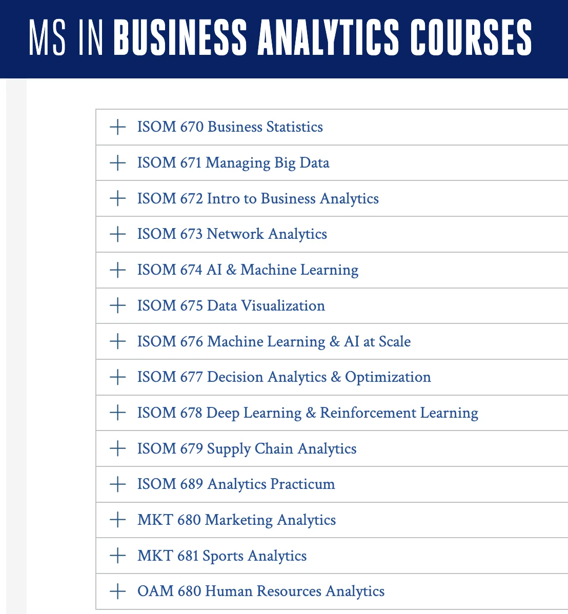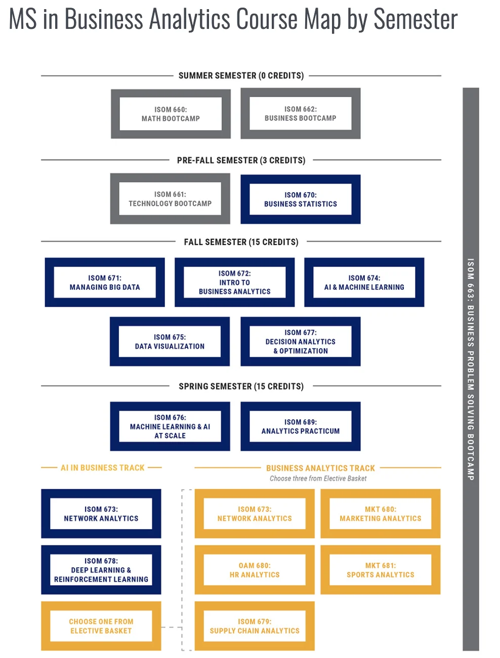 - 项目介绍:Goizueta的STEM指定的商业分析硕士课程将商业、数据和技术结合起来,使学生成为数据驱动世界的有效商业数据科学家。这个为期10个月的全日制沉浸式商业分析学位强调在与联邦快递、洲际酒店集团(IHG)和家得宝等组织的实际合作中进行实践学习,因此,当完成该项目后,学生可以在任何行业中打下基础。在项目进行中,学生将有一个团队帮助你在商业中增长最快的一些领域启动你的数据科学职业生涯。
