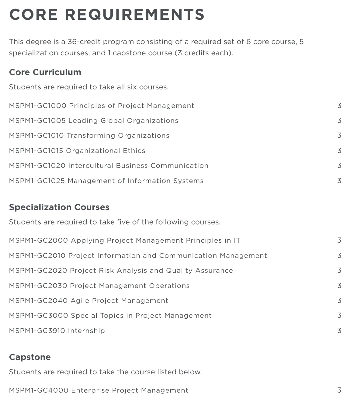 - 课程设置:该学位是一个 36 学分的课程,包括一套必修的 6 门核心课程、5 门专业课程和 1 门Capstone(每门 3 学分)。
