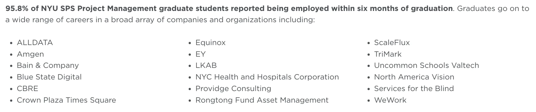 - 就业情况:95.8% 的纽约大学 SPS 项目管理研究生表示在毕业后六个月内找到了工作。