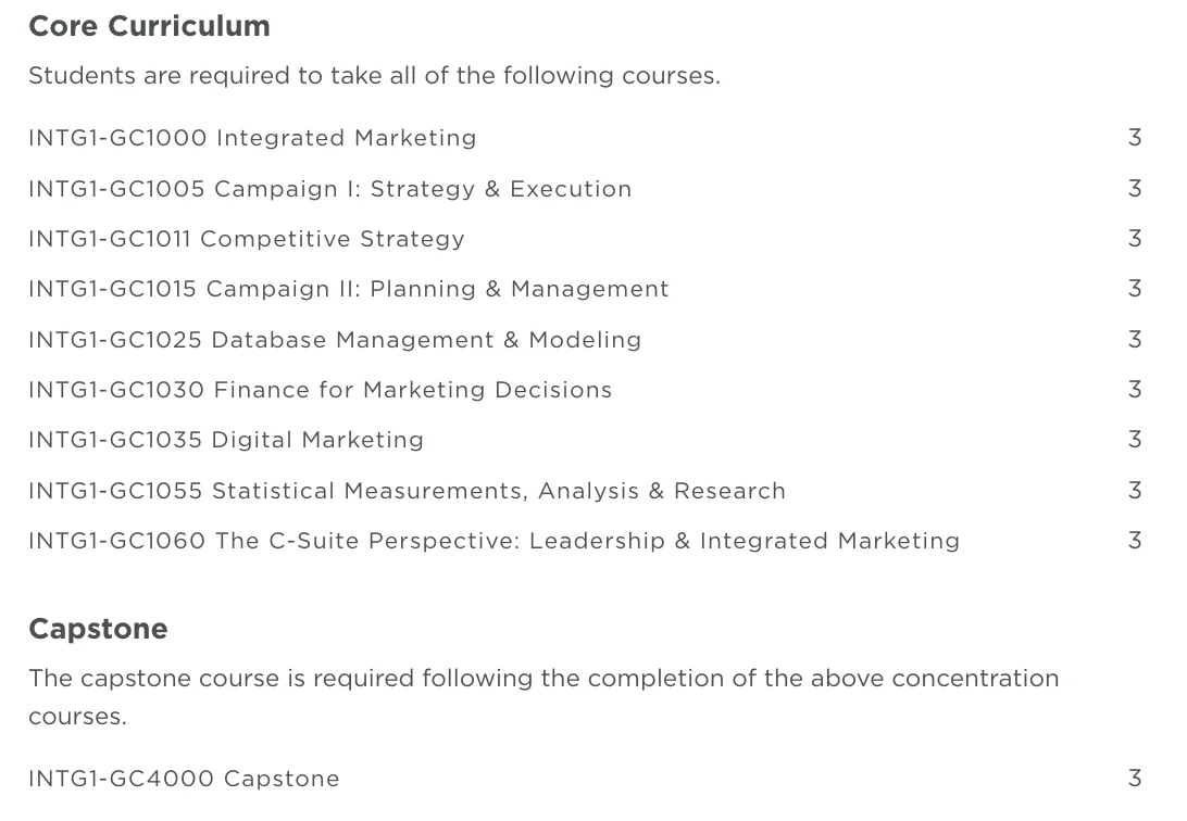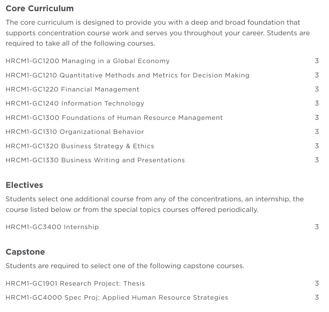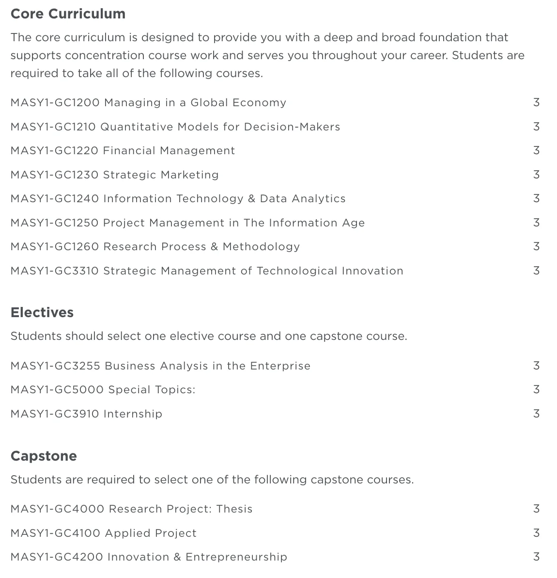 - 课程设置:该学位是一个 42 学分的课程,包括一组必修的 7 门核心课程、4 门学生选择的集中课程和一门必修的Capstone。