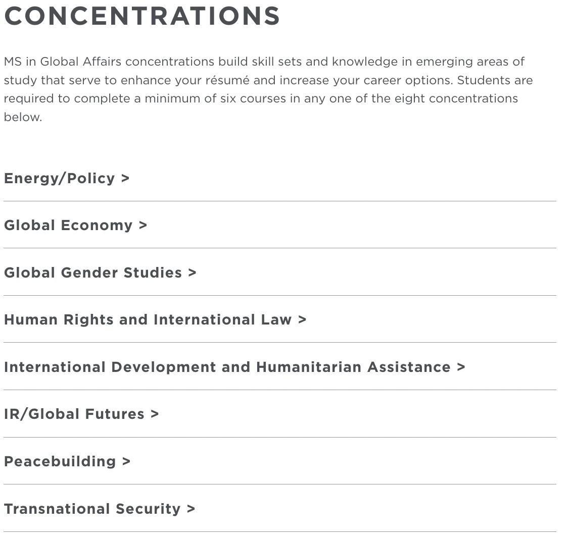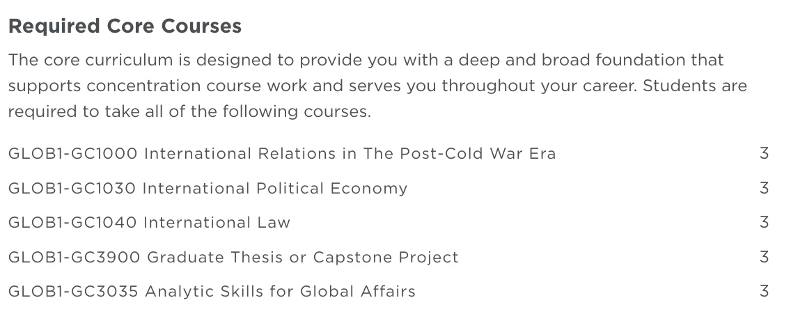 - 课程设置:全球事务硕士课程是一个 42 学分的课程,包括三个组成部分:四门课程的核心课程、专业选择,以及毕业论文或基于团队的Capstone。