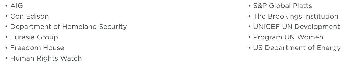 - 就业情况:通过全球事务中心和纽约大学 SPS 的纽约大学沃瑟曼职业发展中心,MSGA 学生有机会完成国际关系实习,这些实习提供加速其职业发展所需的实践经验。其中许多实习会演变成永久性工作。该项目的毕业生在众多公司和组织中从事广泛的职业,包括: