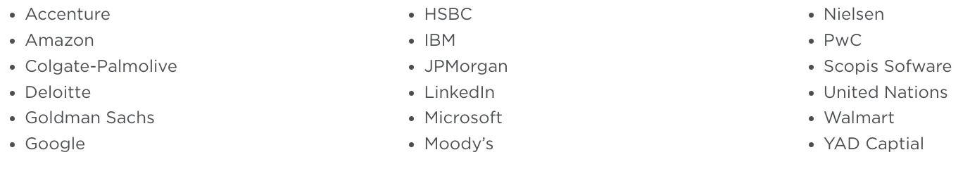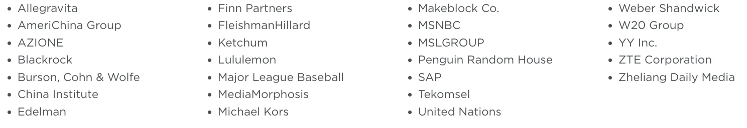 通过商业项目部和纽约大学 SPS 的纽约大学沃瑟曼职业发展中心,公共关系和企业传播硕士学生可以完成实习,这些实习通常会演变成永久性职位。事实上,在过去两年中,93.5% 的学生报告说他们在毕业后六个月内找到了工作。该计划的校友在广泛的公司中获得了工作机会,包括:
