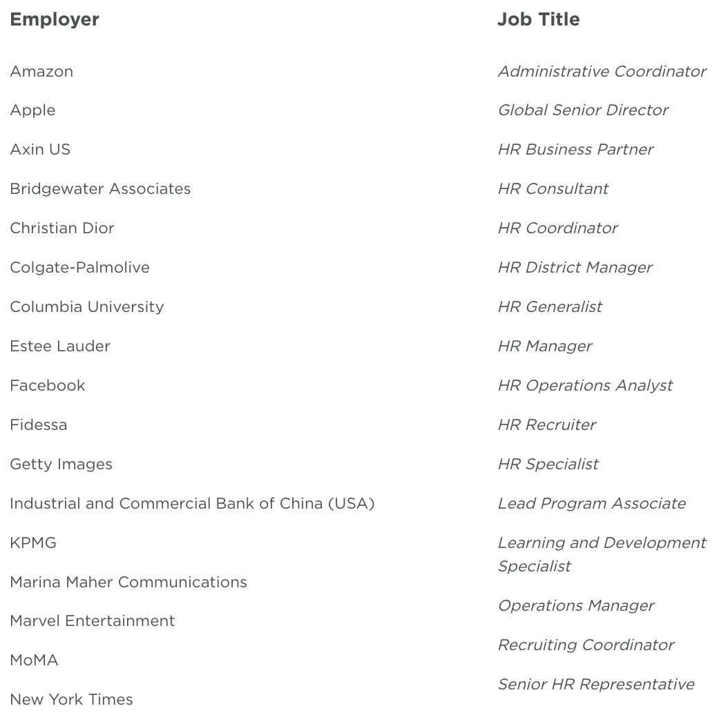 95.3% 的 NYUSPS 人力资源管理和发展研究生报告称在毕业后六个月内找到了工作。以下是过去五年报告的样本雇主和职位名称: