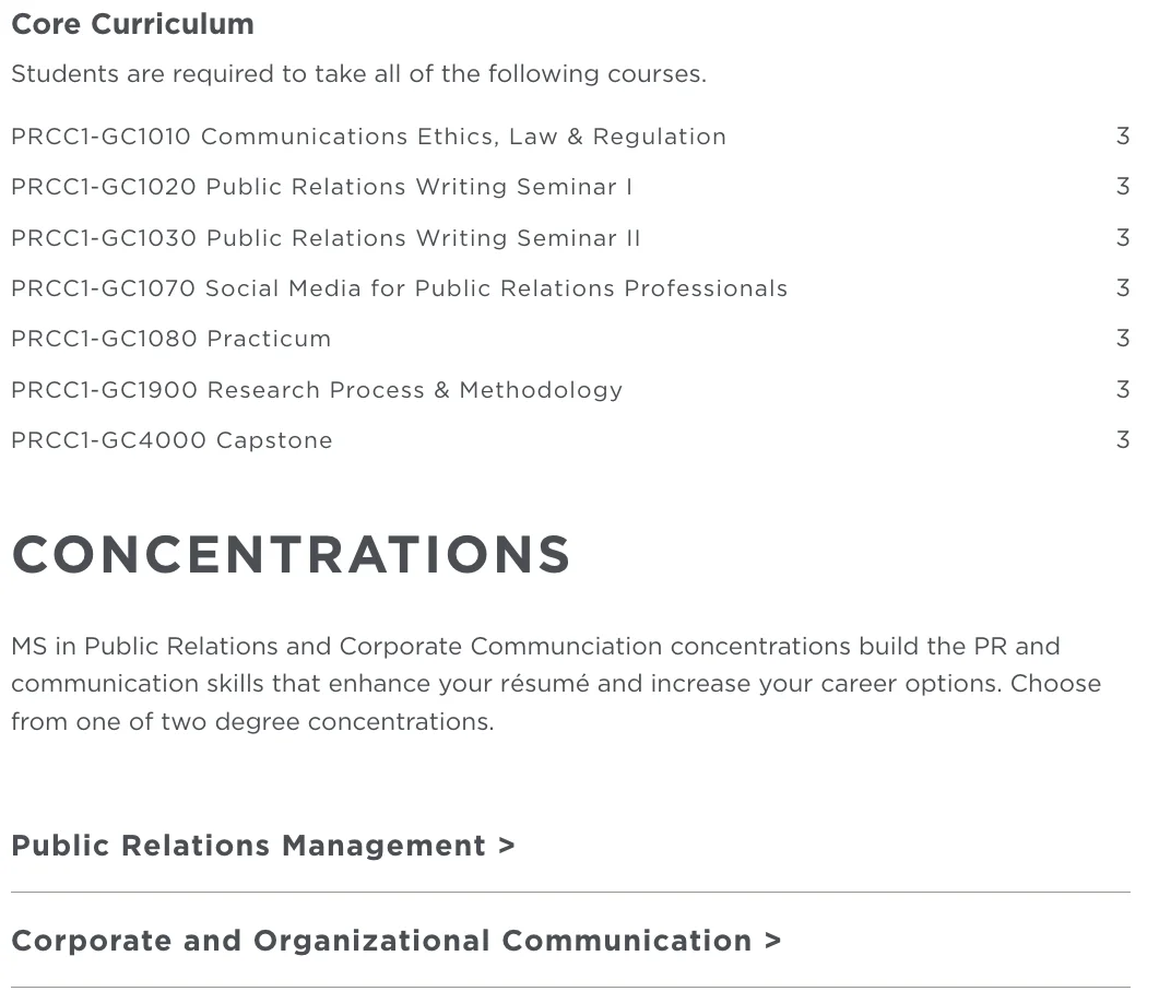- 项目介绍:纽约大学SPS商业项目部综合营销和传播系提供的公共关系和企业传播硕士(PRCC)为学生提供开发公共关系和传播战略所需的技能和实践经验,以提升品牌,建立声誉,并管理广泛行业的危机。与传统的公共关系硕士不同,这个学位站在营销和公共关系的十字路口,在各种数字平台--社交媒体、博客和网络上磨练学生的写作和沟通技能。学生获得了纽约大学的优势,这为在纽约市和全球范围内的职业机会打开了大门。