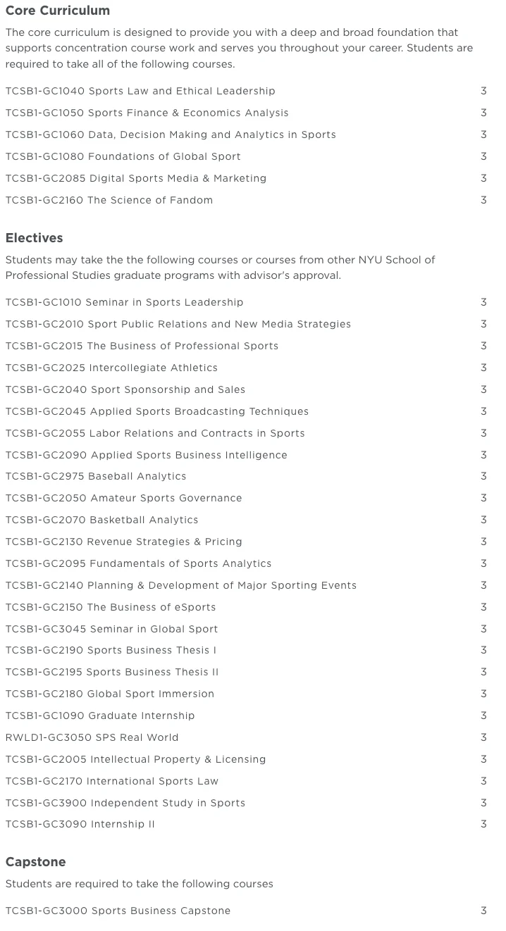 - 课程设置:体育商业理学硕士是一个 36 学分的学位课程,包括一组必修的核心课程、选修课和一门Capstone。