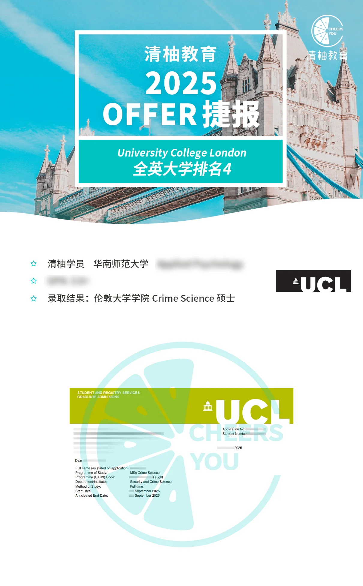 伦敦大学学院Crime Science硕士录取!