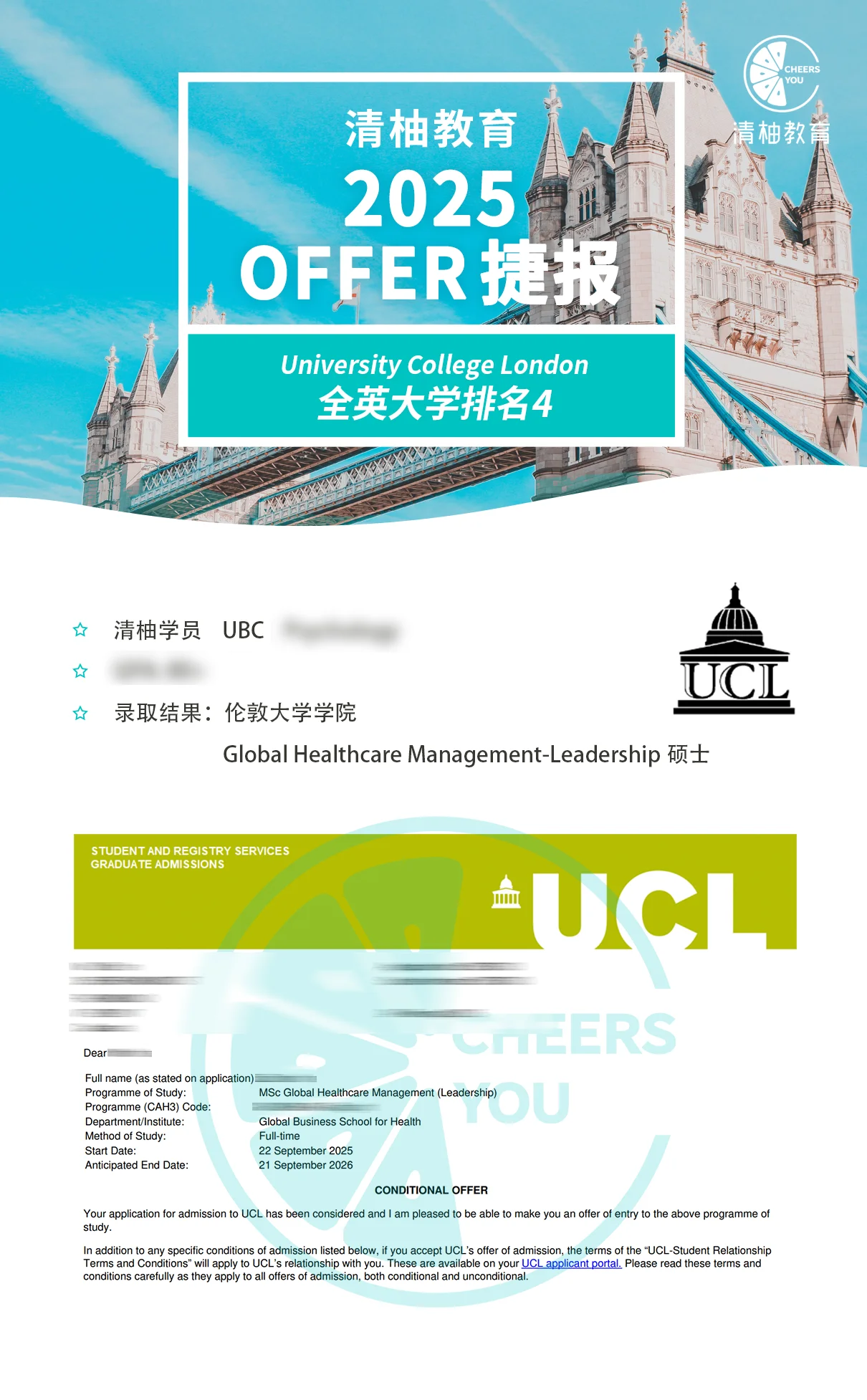 伦敦大学学院Global Healthcare Management (Leadership) 硕士录取!